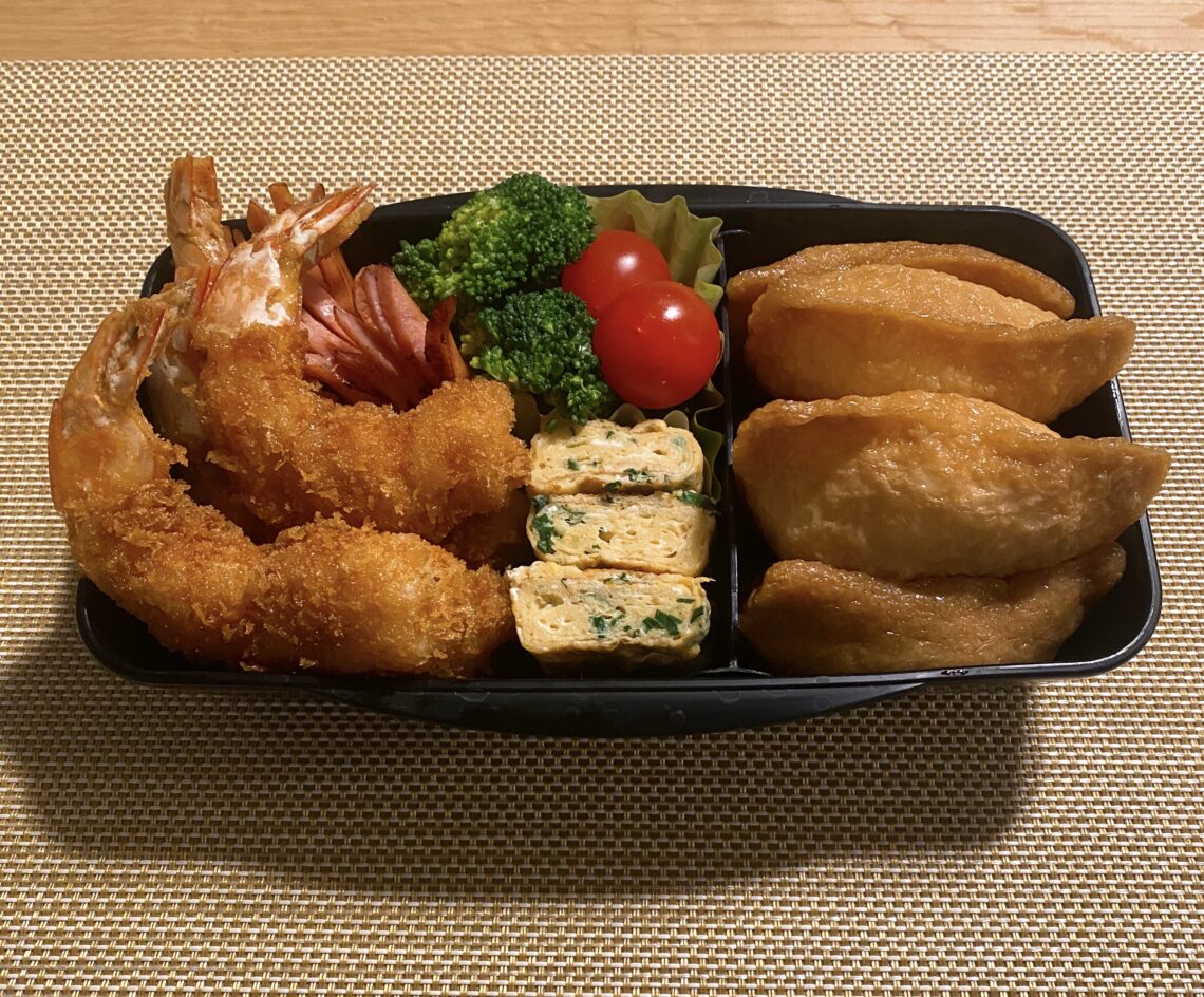 最後は息子のリクエストで、運動会や特別な日に作っていた「エビフライとお稲荷さん」。